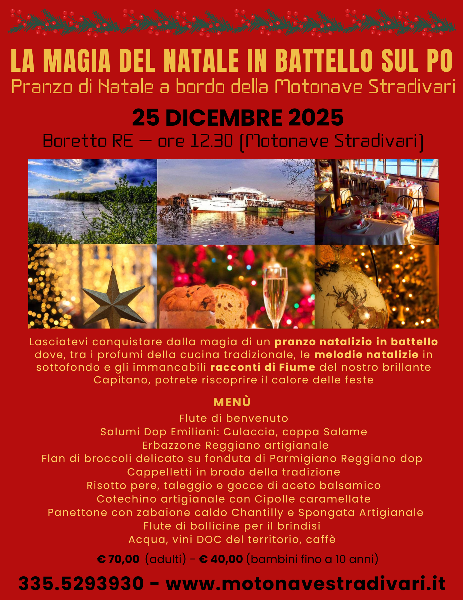 Il Capodanno più raffinato d’Italia vi aspetta a bordo della Motonave Stradivari, l’elegante icona del Po, simbolo di charme senza paragoni. Per la notte di San Silvestro, il Battello resterà ormeggiato lungo le rive del Grande Fiume, trasformandosi in una scenografia unica e magica: un vero e proprio gioiello galleggiante che apre le sue sale addobbate a festa per accogliervi in un’atmosfera da sogno. Qui, tra le luci soffuse e il riflesso del fiume che scorre accanto, vi attende un Gran Veglione di Capodanno con la Cena di gala servita al tavolo e rigorosamente cucinata al momento dal nostro chef di bordo, l’immancabile Brindisi di mezzanotte e la sfavillante Festa danzante. Tutto rievocherà il fascino delle notti parigine a bordo dei Bateaux Mouches, ma con un’anima autenticamente italiana. Sarà una notte indimenticabile, sospesa tra acqua e cielo, tra eleganza e festeggiamenti: il modo più magico per dare il benvenuto al nuovo anno.