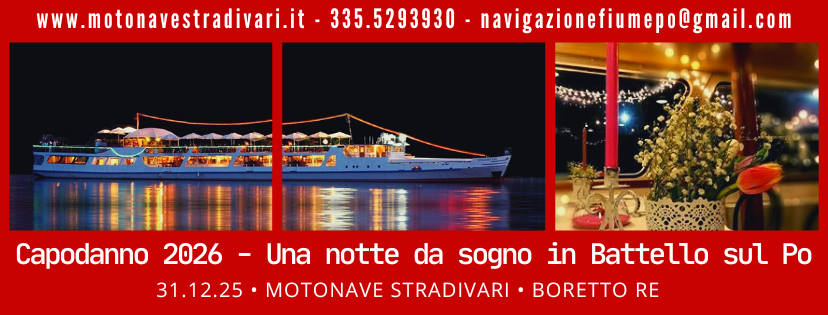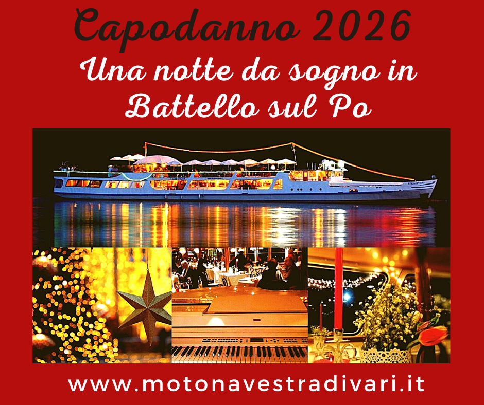 Il Capodanno più raffinato d’Italia vi aspetta a bordo della Motonave Stradivari, l’elegante icona del Po, simbolo di charme senza paragoni. Per la notte di San Silvestro, il Battello resterà ormeggiato lungo le rive del Grande Fiume, trasformandosi in una scenografia unica e magica: un vero e proprio gioiello galleggiante che apre le sue sale addobbate a festa per accogliervi in un’atmosfera da sogno. Qui, tra le luci soffuse e il riflesso del fiume che scorre accanto, vi attende un Gran Veglione di Capodanno con la Cena di gala servita al tavolo e rigorosamente cucinata al momento dal nostro chef di bordo, l’immancabile Brindisi di mezzanotte e la sfavillante Festa danzante. Tutto rievocherà il fascino delle notti parigine a bordo dei Bateaux Mouches, ma con un’anima autenticamente italiana. Sarà una notte indimenticabile, sospesa tra acqua e cielo, tra eleganza e festeggiamenti: il modo più magico per dare il benvenuto al nuovo anno.